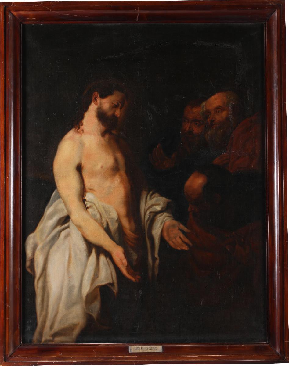 Данное произведение является копией с картины «Явление Христа ученикам» (другое название «Неверие Фомы», 1625-1626 годов) фламандского художника Антониса Ван Дейка. В настоящее время оригинал хранится в Государственном Эрмитаже. Он был написан в период пребывания художника в Италии. В центре композиции – воскресший Христос предстает перед тремя Своими учениками, двое из которых, вероятно, Петр и Павел, смотрят на Него в благоговейном изумлении, а третий, Фома, опустился на колени, чтобы поближе разглядеть раны на ладонях Спасителя. Освещенная ярким светом фигура Христа развернута вправо, голова склонена на бок. Произведение отличает сдержанный колорит, чередование светлых и темных участков, мягкие полутени.