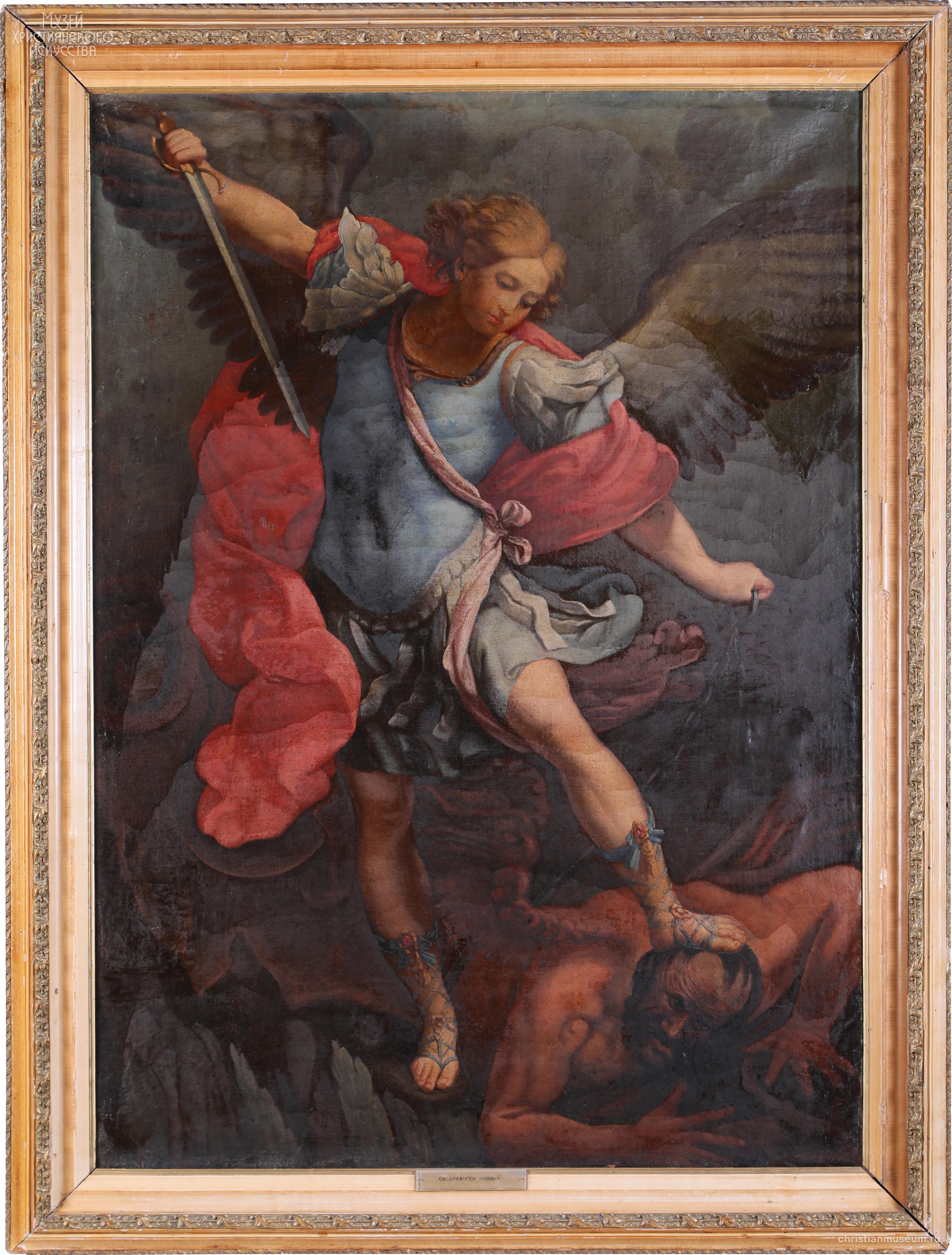Картина является копией с произведения итальянского художника Гвидо Рени, которое он создал для римской церкви Санта-Мария-делла Консеционе деи Капучини около 1635 года. В центре – ростовое изображение Архангела Михаила, облаченного в римские доспехи синего цвета, за спиной развевается красный плащ, на ногах – сандалии. Фигура в сложном повороте вправо, крылья расправлены, левой ногой Архангел наступает на голову поверженного сатаны. Правая рука с обнаженным мечом занесена вверх, в левой – держит цепь, которой связан сатана. На заднем плане – условный скальный пейзаж.
