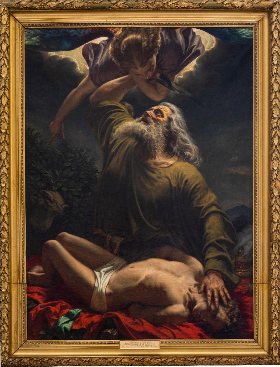 Сюжетом для картины стал ветхозаветный эпизод, в котором Бог повелел Аврааму принести своего любимого сына Исаака во всесожжение на одной из гор в земле Мория (Быт. 22:1-19). Авраам повиновался и отправился с Исааком в указанное место. Там Авраам устроил жертвенник, связал Исаака, положил его на жертвенник поверх дров и уже занёс над ним нож, когда ангел воззвал к нему с неба: «Авраам! Авраам! <...> не поднимай руки твоей на отрока и не делай над ним ничего, ибо теперь Я знаю, что боишься ты Бога и не пожалел сына твоего, единственного твоего, для Меня» (Быт. 22: 11-12). Вместо Исаака в жертву был принесён баран, который запутался в чаще неподалеку.