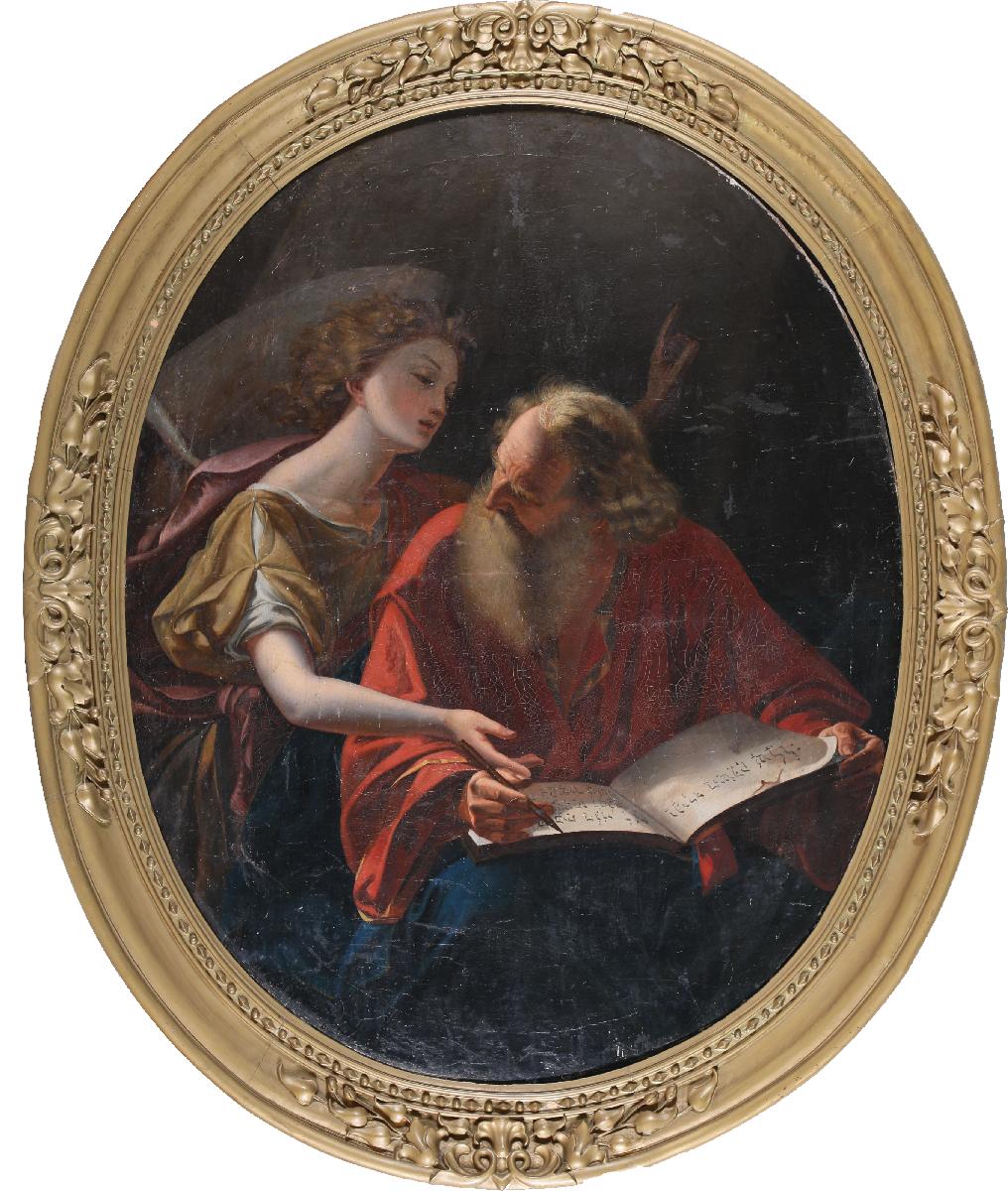 Изображение овальной формы, расположено вертикально. В центре – сидящая фигура апостола и евангелиста Матфея с раскрытой на коленях книгой. Голова несколько склонена вниз и повернута влево. В правой руке апостол держит писчий инструмент, левой – придерживает уголок книги. Облачен в свободные одежды алого и темно-синего цветов. За правым плечом евангелиста – фигура ангела со светлым миловидным ликом, бледной кожей и золотистыми вьющимися волосами. Голова повернута вправо, взгляд обращен на апостола Матфея. Правой рукой ангел указывает на книгу, перстом левой – вверх. Фон – глухой, темный, однотонный.