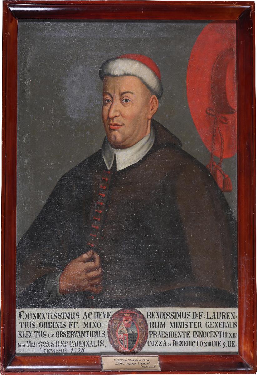 На поясном портрете кардинал Лаврентий изображен в трехчетвертном повороте влево, правая рука на груди, дотрагивается до пуговиц. Кардинал облачен в коричневую рясу ордена францисканцев и красную шапочку с белой меховой опушкой. Фон однотонный, плотный. В правом верхнем углу изображена красная кардинальская шляпа с широкими полями. По нижнему краю картины расположена белая плакетка с текстом на латыни, разбитым по середине гербом кардинала.
