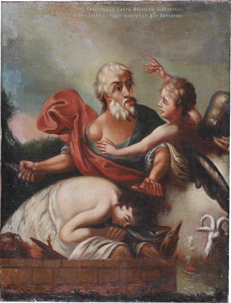 Наверху по центру в две строки рифмованная надпись: «Сень Грядущихъ Благъ АвраАмъ Изобразилъ // какъ сына съ верою нажертву Бгу приносилъ»Иконография: