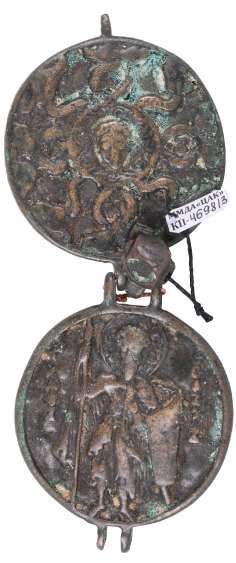 Обратите внимание на его конструкцию. Если обычный змеевик двусторонний, как монета, то этот имеет две створки. Возможно, такой медальон предназначался для хранения святыни. Его устройство напоминает конструкцию других предметов меднолитой пластики, куда помещали почитаемые реликвии. В домонгольскую эпоху это были кресты-энколпионы и иконы-энколпии.