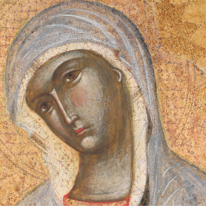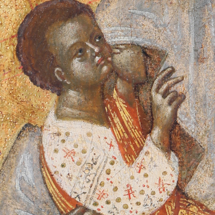 Пунктирная гравировка золотого фона – характерная черта произведений, созданных во второй четверти XIV века мастерской Паоло Венециано. Мафорий Богоматери, который сейчас выглядит почти прозрачным, по-видимому, первоначально был темно-синим с украшенной золотым орнаментом каймой, звездами на лбу и плечах, как на аналогичных венецианских иконах того же периода. Несмотря на утрату верхнего слоя, на мафории и белой накидке остались тени от золотого узора (возможно, более позднего), который украшал одежды Богородицы.
