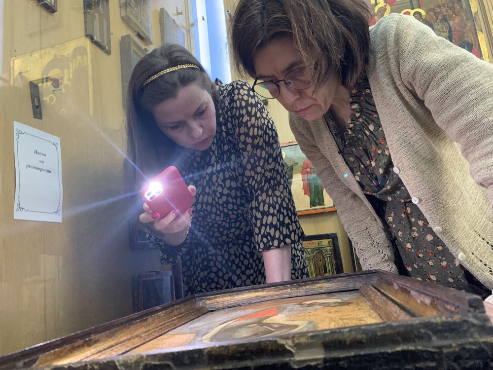 Искусствовед Ирина Орецкая и реставратор Ольга Воскресенская осматривают икону в экспозиции Музея христианского искусства